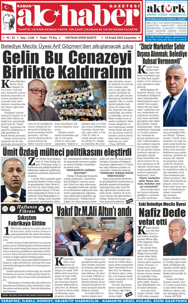 14 Aralık 2022 Çarşamba günü yayınlanan 1146 Sayılı Gazetemizin basılı nüshası. Gazetemizin tamamını okumak için lütfen gazetemizi alınız…