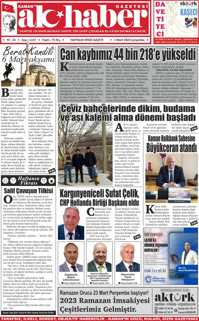 1 Mart 2023 Çarşamba günü yayınlanan 1157 Sayılı Gazetemizin basılı nüshası. Gazetemizin tamamını okumak için lütfen gazetemizi alınız…